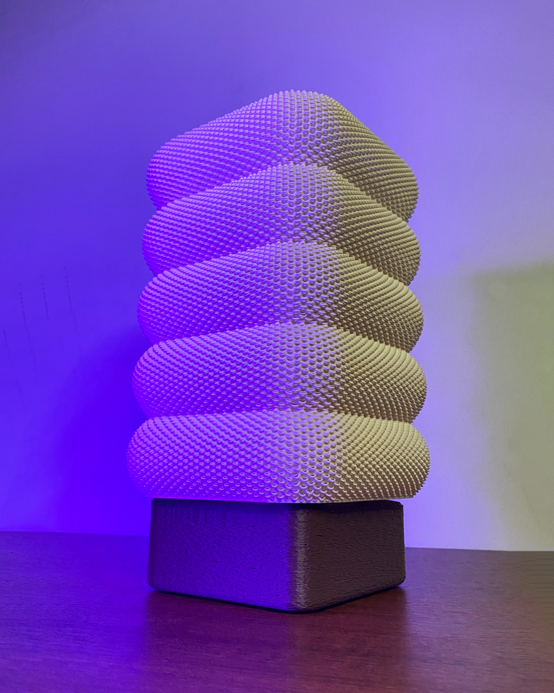 Fabricada en plástico con impresión 3D, esta lámpara combina durabilidad y estilo, convirtiéndose en un elemento decorativo que complementa diversos ambientes. Su tecnología de iluminación LED asegura un consumo eficiente de energía, lo que la convierte en una opción sostenible y económica para iluminar tu hogar.